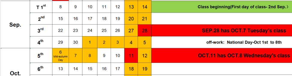 Please be informed of the following adjustments to the class schedule due to the upcoming National Day holiday: